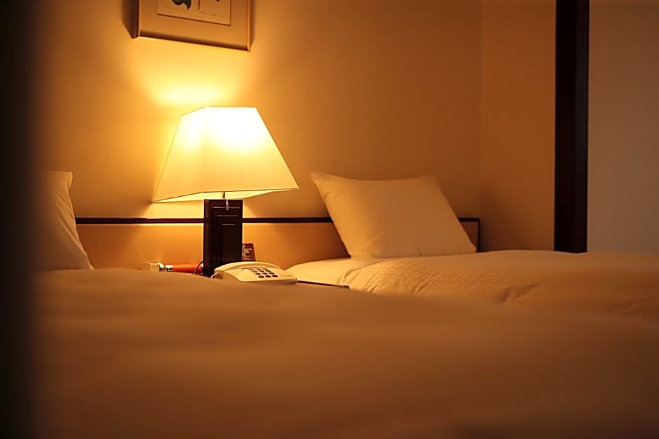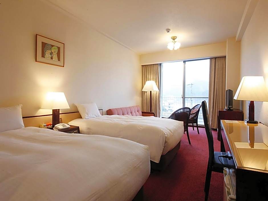 Features Western beds and traditional futon bedding on a tatami (woven-straw) area. This room has a balcony and air conditioning